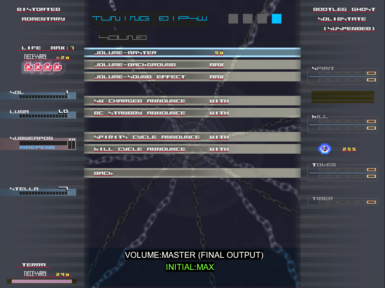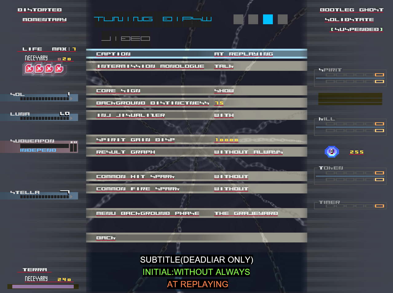 - CAPTION - decides when to show dialogue on screen when playing as DEADLIAR. Options are WITHOUT ALWAYS (never), AT REPLAYING (only shows when watching replays) and WITH ALWAYS (shows always, including during gameplay).